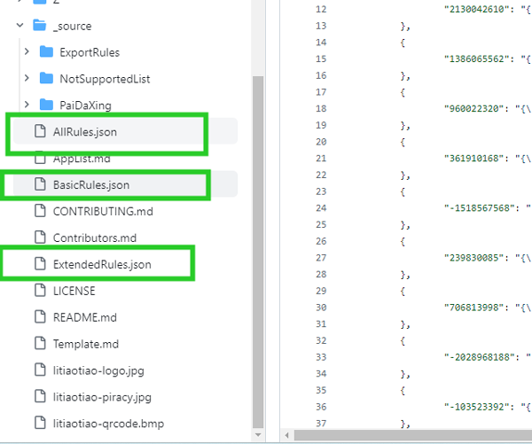不过这里小编可是把最新的代码全部复制过来了,这里主要提供了三个规则代码,一个是基础规则代码、一个是扩展规则代码、一个就全部规则代码,从字面上意思也不然理解全部规则代码就是包含了基础规则代码和扩展规则代码,这可不是小编在这瞎说的,是在github代码库列表中所呈现的。如下图所示,用户只要在代码列表中找到json文件即可,这些规则代码就是以json格式书写的,有点编程经验的用户一看到json文件自然就知道其强大的跨平台文件交换功能了,在很多编程场景都能用到,无论是c++,还是java,无论是前端还是后端开发者都要接触并使用到这种格式文件的。