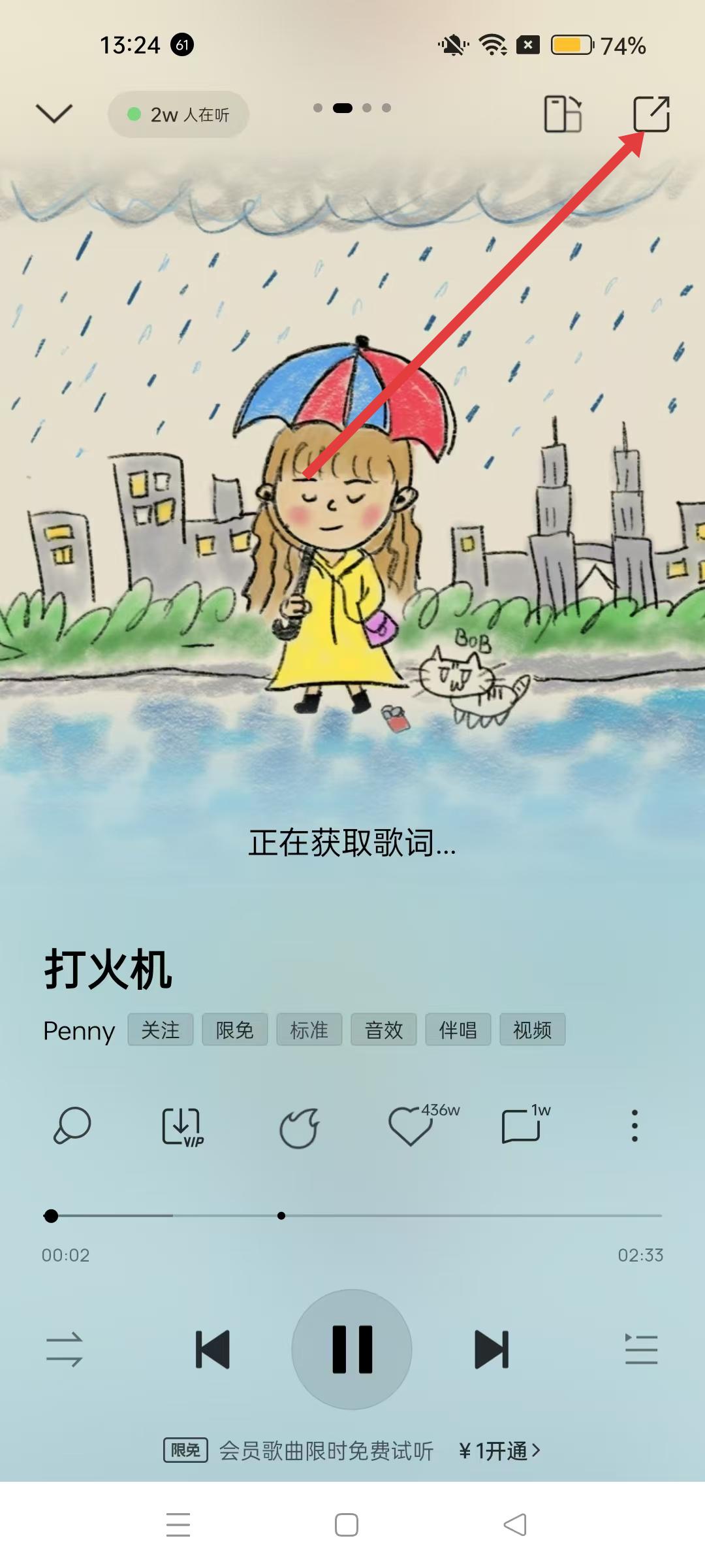 2、歌曲播放界面,点击右上角的分享图标,打开分享选项界面。